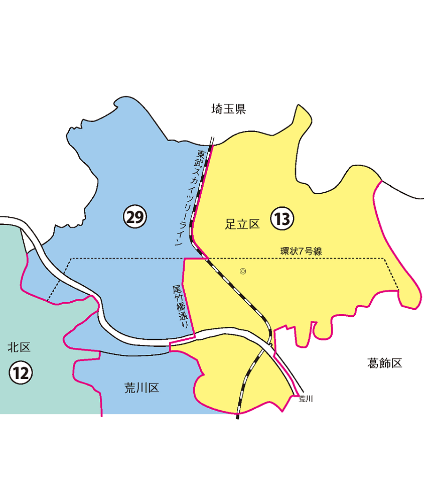 第13区に属しない区域(以下の地域) 伊興1丁目~5丁目、伊興本町1丁目、伊興本町2丁目、入谷1丁目~9丁目、入谷町、扇1丁目~3丁目、 興野1丁目、興野2丁目、小台1丁目、小台2丁目、加賀1丁目、加賀2丁目、栗原3丁目、栗原4丁目、 江北1丁目~7丁目、古千谷1丁目、古千谷2丁目、古千谷本町1丁目~4丁目、皿沼1丁目~3丁目、 鹿浜1丁目~8丁目、新田1丁目~3丁目、椿1丁目、椿2丁目、舎人1丁目~6丁目、舎人公園、舎人町、 西新井1丁目~7丁目、西新井栄町3丁目、西新井本町1丁目~5丁目、西伊興1丁目~4丁目、西伊興町、 西竹の塚1丁目、西竹の塚2丁目、東伊興1丁目~4丁目、堀之内1丁目、堀之内2丁目、宮城1丁目、 宮城2丁目、本木1丁目、本木2丁目、本木東町、本木西町、本木南町、本木北町、谷在家1丁目~谷在家3丁目 |